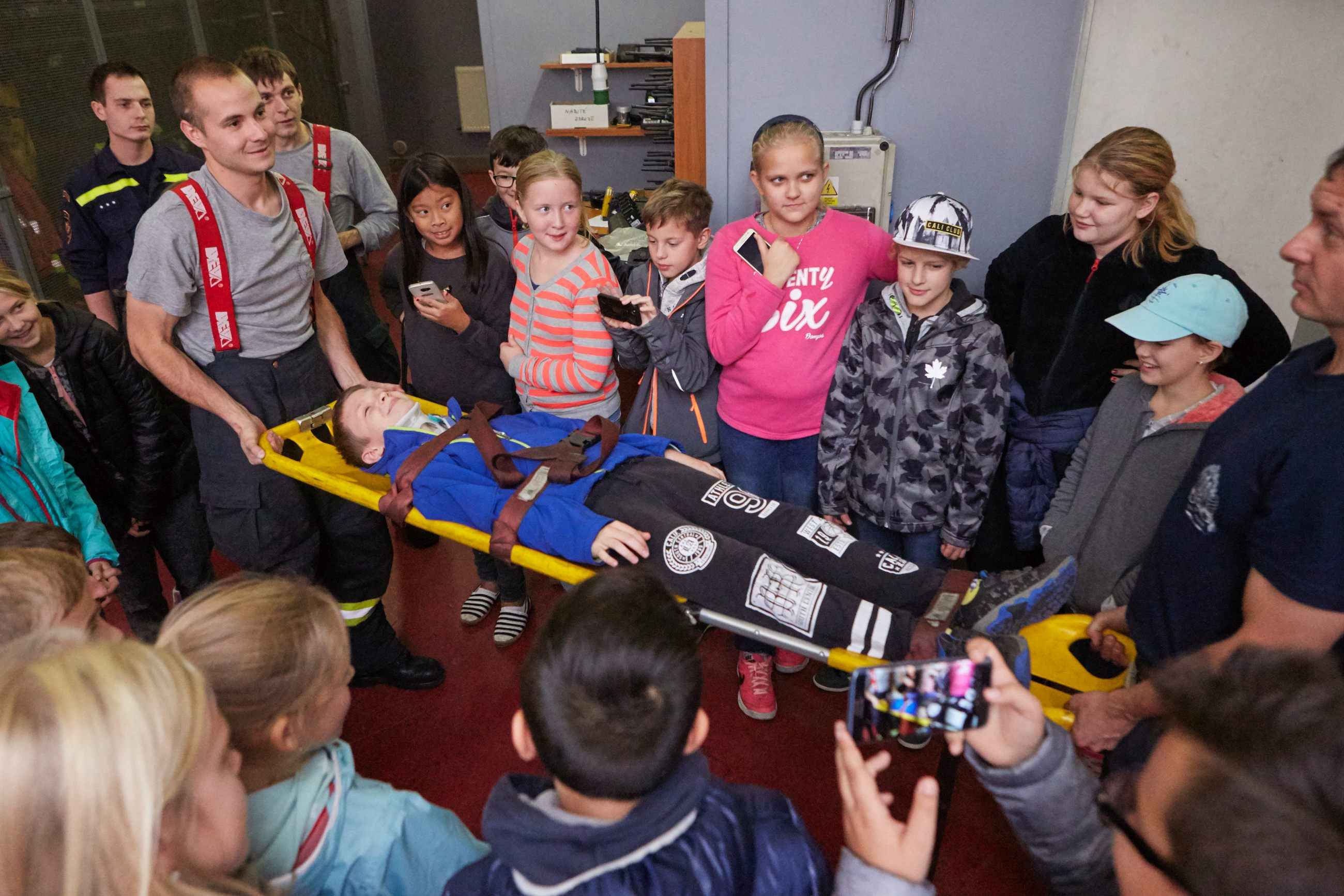 Žáci 5. tříd navštívili v rámci prvního oborového dne hasičský záchranný sbor v Praze. Žákům se věnovalo 6 hasičů, kteří žáky seznámili nejprve se svou činností a poté žákům umožnili projít některé prostory stanice. Žáci se mohli posadit do hasičského záchranného vozu, vyzkoušeli speciální helmy i kyslíkovou bombu, která vážila skoro stejně jako oni sami. Prohlédli si a potěžkali některá hasičská náčiní – stříkačky, hadice, sekyru nebo třeba beranidlo na vyrážení dveří. Hasiči jednoho ze žáků názorně naložili na nosítka, připevnili mu záchranný límec a demonstrovali tak záchranu a transport zraněných. Dále žáci viděli, jakým způsobem se hasič připravuje na výjezd. Nejvíce se jim líbily požární tyče a překvapilo je, že i uprostřed noci mají hasiči pouze dvě minuty na to, aby se probudili, připravili a nasedli do auta. Žáci měli na konci prostor pro dotazy. Všichni odcházeli s velice pozitivním zážitkem!