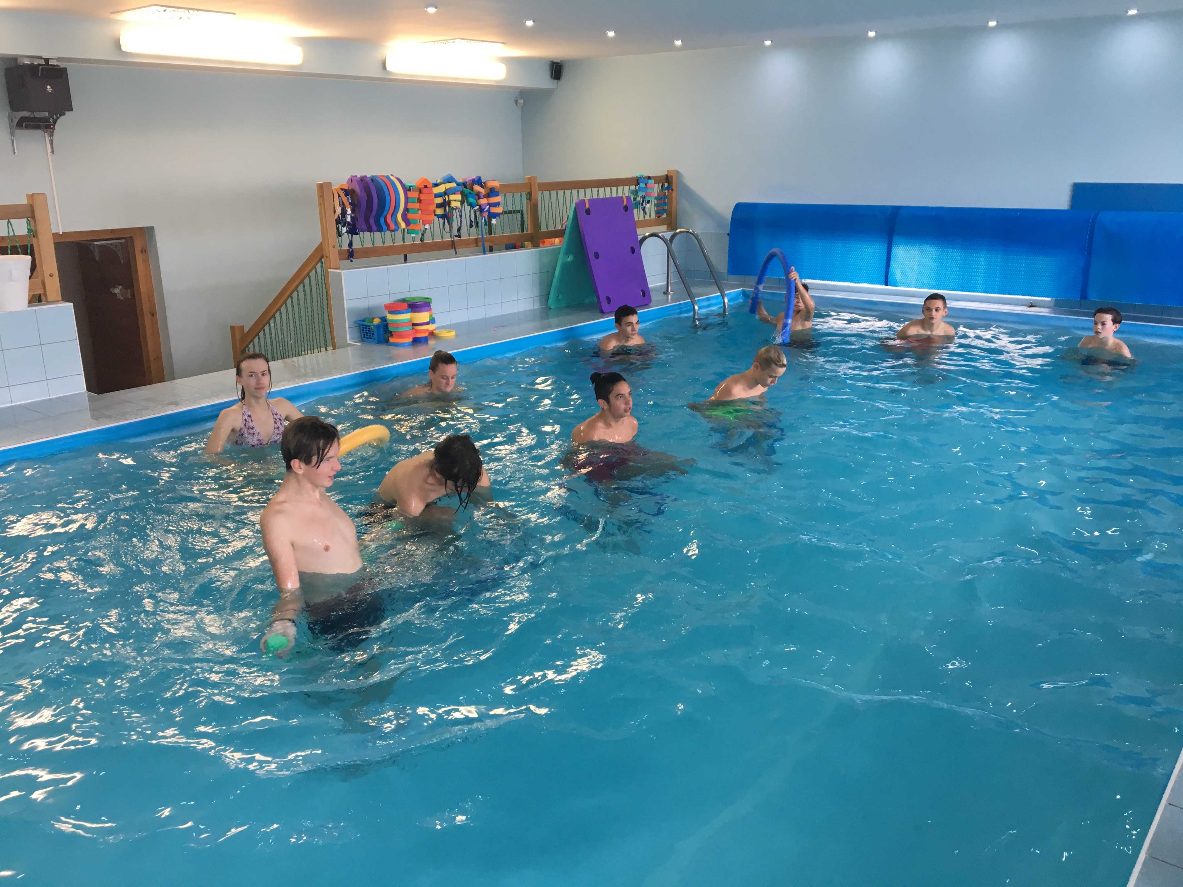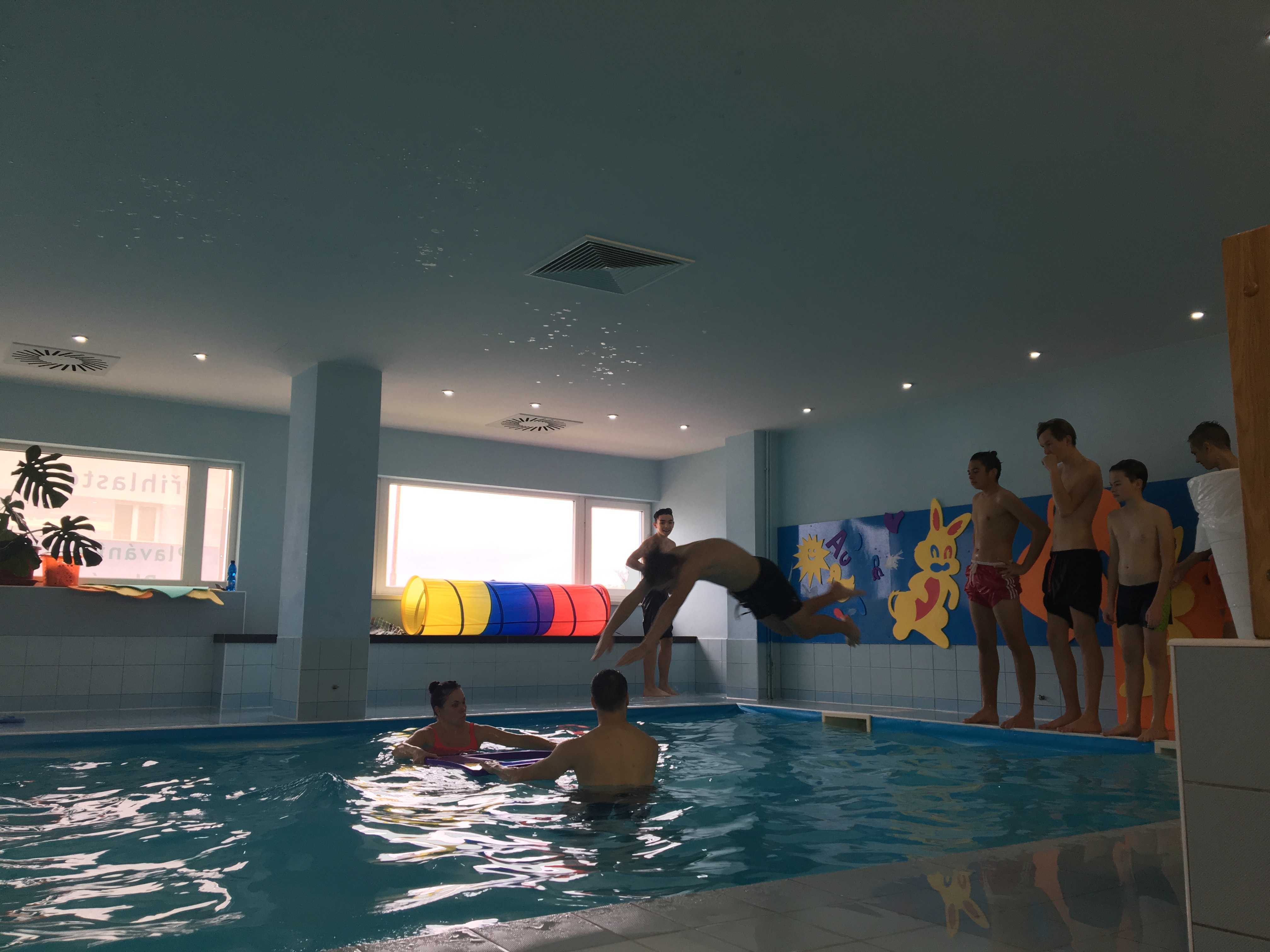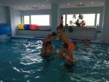 Pak jsme se vydali do jesenického bazénku, kde jsme si vyzkoušeli hodinu aqua aerobiku, abychom zjistili, že cvičení ve vodě je velmi náročné a unavující. A pak už rychle do školy na oběd.