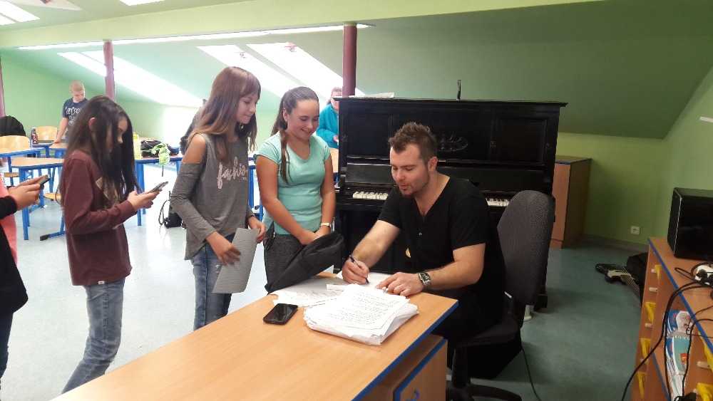 V prvním bloku oborového dne si děti připravily otázky, které poté použily při asi hodinovém rozhovoru s Davidem. Následovala hudební okázka, kdy nám David zahrál a zazpíval 2 písně, poté si vyslechl zpěv žákyně 9.A- Nikoly Tomšíkové a řekl jí cenné konstruktivní připomínky. V závěrečném bloku si celá oborová skupina s Davidem zazpívala píseň Halleluja a na konec se děti společně s mladým umělcem vyfotily a proběhla malá autogramiáda.