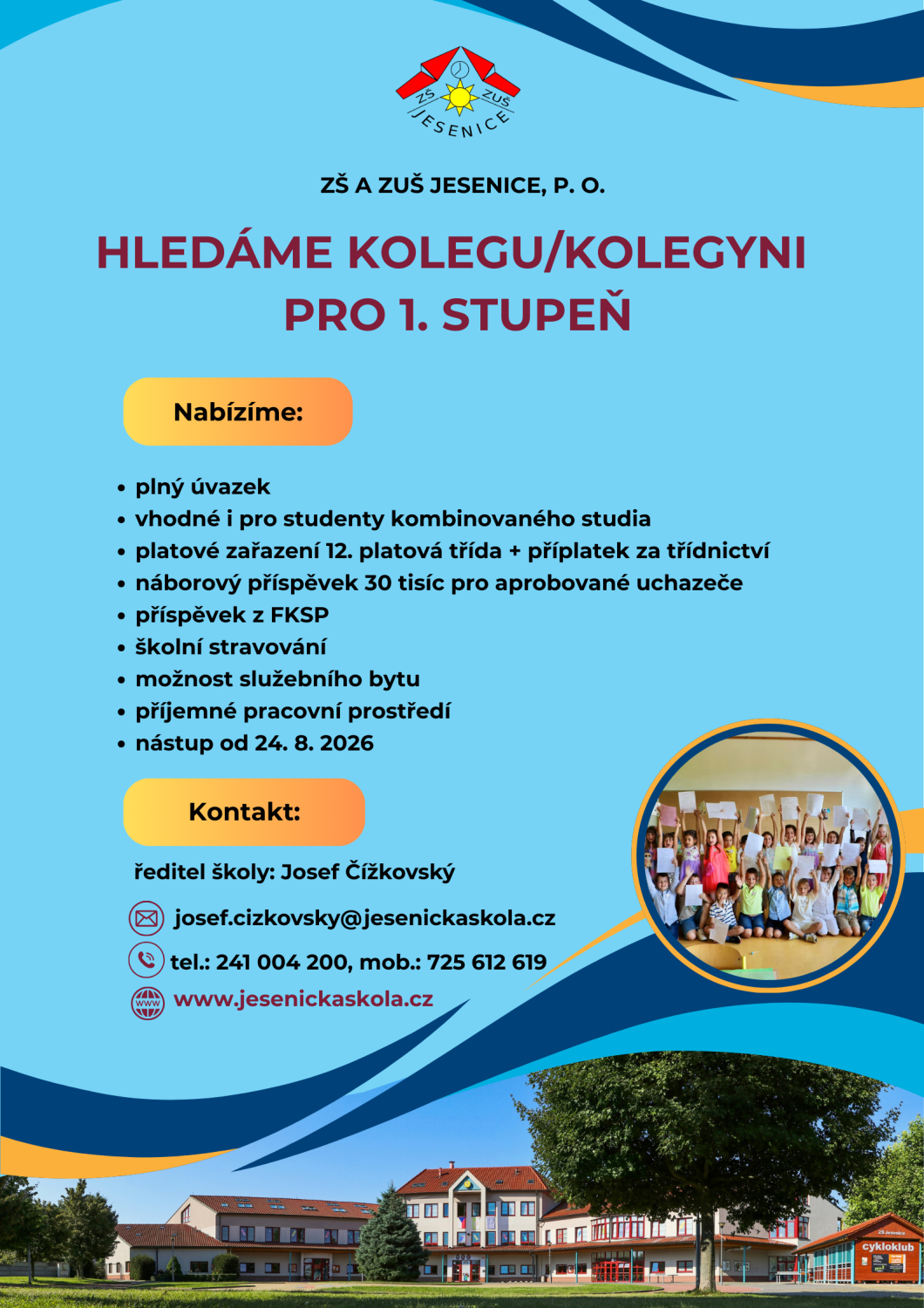 ZÁKLADNÍ ŠKOLA A ZÁKLADNÍ UMĚLECKÁ ŠKOLA JESENICE HLEDÁ NOVÉ KVALIFIKOVANÉ KOLEGYNĚ/KOLEGY NA NÍŽE UVEDENÉ PRACOVNÍ POZICE: